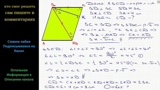 Геометрия Диагональ BD параллелограмма ABCD является его высотой и равна стороне BC Найдите сторону CD параллелограмма если точка B удалена
