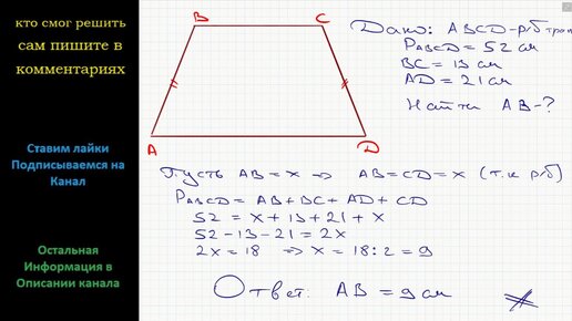 Геометрия Периметр равнобокой трапеции равен 52 см, основания – 13 см и 21 см. Найдите боковую сторону трапеции