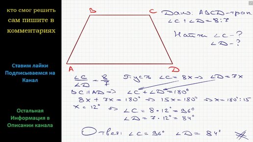 Геометрия Найдите углы трапеции ABCD, прилежащие к боковой стороне CD, если угол C : углу D = 8 : 7.