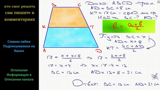 Геометрия Одно из оснований трапеции на 8 см больше другого, а средняя линия трапеции равна 17 см. Найдите основания трапеции