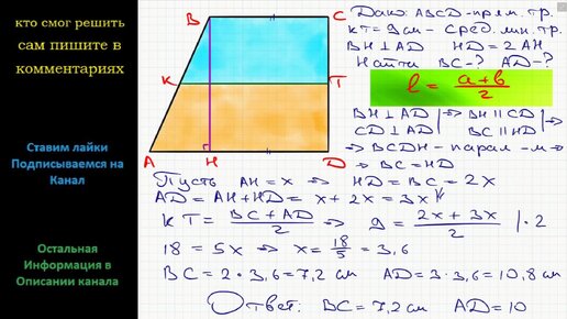Геометрия Средняя линия прямоугольной трапеции равна 9 см, а высота, проведенная из вершины тупого угла, делит большее основание на отрезки