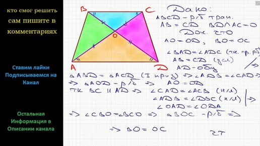 Геометрия Диагонали равнобокой трапеции ABCD (AB=CD) пересекаются в точке O. Докажите, что AO=OD и BO=OC.
