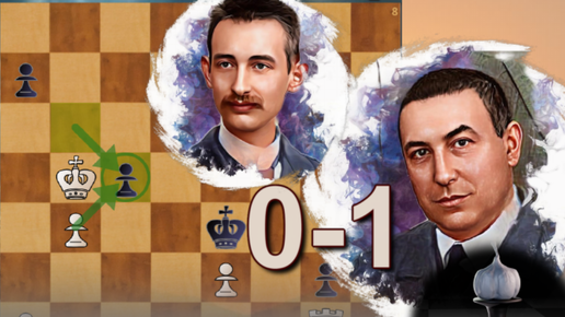 Убойное окончание: Акиба Рубинштейн (черные) молча давит в пешечном "ладейнике", обыгрывая мастерски Карла Шлехтера во французской, 1912