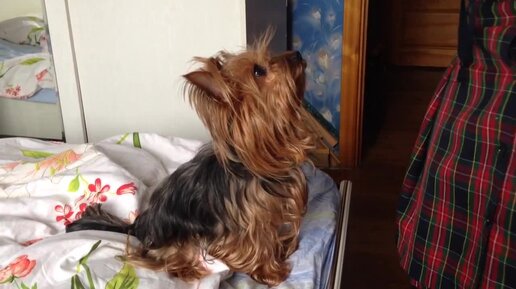 Funny yorkie on the bed (cute little dog)
