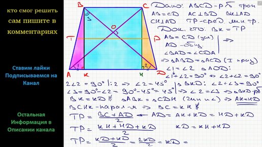 Геометрия Докажите, что если диагонали равнобокой трапеции перпендикулярны, то ее высота равна средней линии трапеции