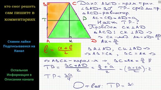 Геометрия Диагональ прямоугольной трапеции разбивает ее на два треугольника, один из которых является равносторонним со стороной a. Найдите
