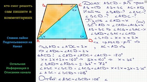 Геометрия Диагональ равнобокой трапеции разбивает ее на два равнобедренных треугольника. Найдите углы трапеции