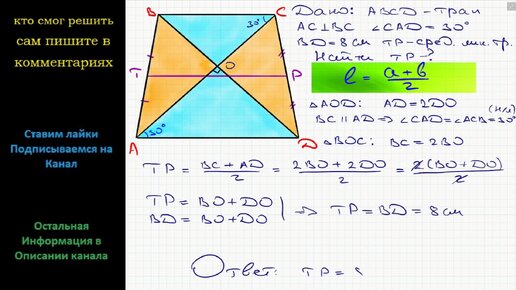 Геометрия В трапеции ABCD (BC ll AD) известно, что AC ┴ BD, угол CAD = 30, BD = 8 см. Найдите среднюю линию трапеции