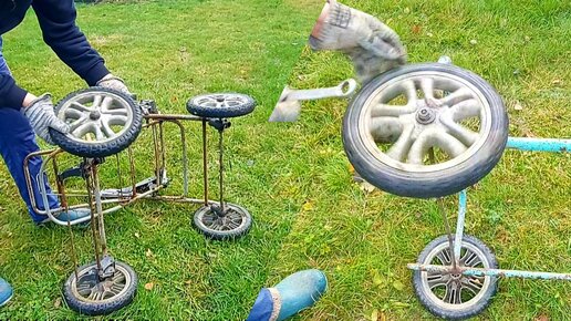 Взял коляску, старые сани и сделал своими руками самоделку. Получилась самодельная простая четырёхколёсная телега