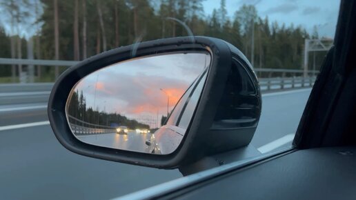 Закат в Петербурге в боковое зеркало заднего вида. Въезд с севера на ЗСД