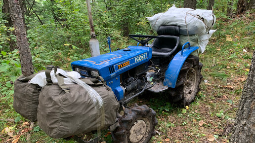 Груженый мини трактор ISEKI TX 1300 спускаемся с сопки