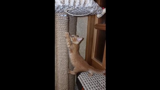 Рыжий котенок Корнелиус учится забираться в кошачий дом.