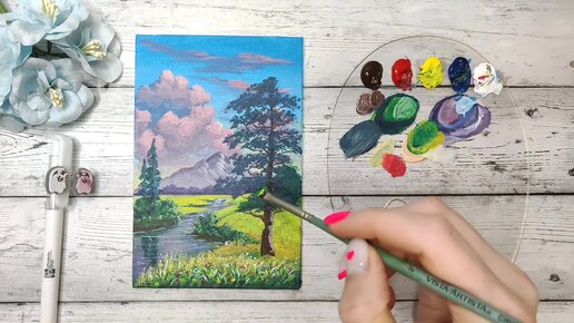 Как легко нарисовать горный пейзаж с деревом и рекой🏞️ Пошаговое видео 🎥 Акриловая живопись 🎨