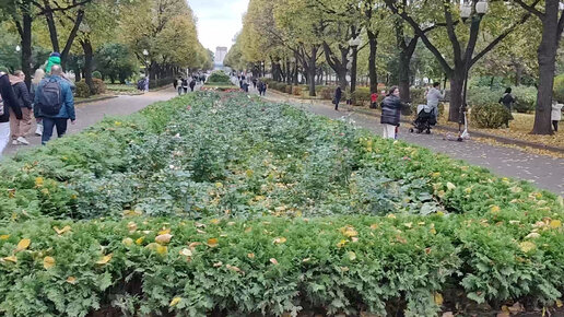 Осенний парк Горького. Строительство ледового катка. Песчаный пляж у Пионерского пруда. Цветочные клумбы с множеством цветов