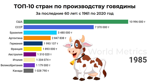 ТОП-10 стран по производству говядины каждый год, начиная с 1961 года