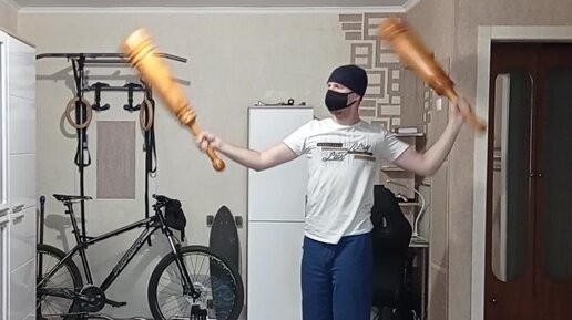Нисходящие махи перед собой, палицы 2 по 3 кг.