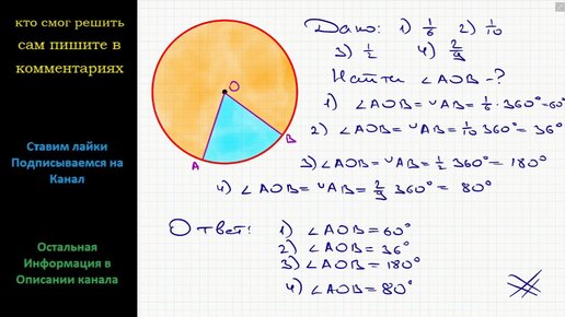 Геометрия Чему равна градусная мера центрального угла окружности, опирающегося на дугу, которая составляет: 1) 1/6 окружности; 2) 1/10 окр