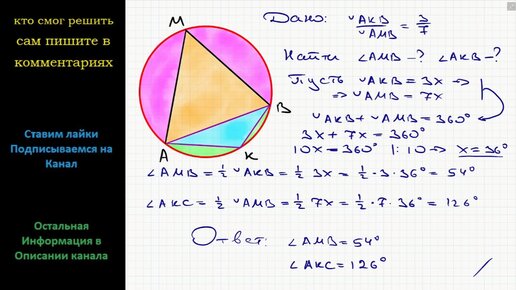 Геометрия Концы хорды AB делят окружность на две дуги, градусные меры которых относятся как 3:7. Под какими углами видна эта хорда из точек