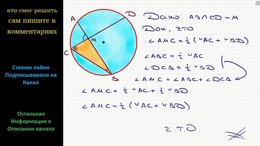 Геометрия Хорды AB и CD окружности пересекаются в точке M (см. рис. 14 сек.). Докажите, что угол AMC = 1/2(дуга AC + дуга BD)