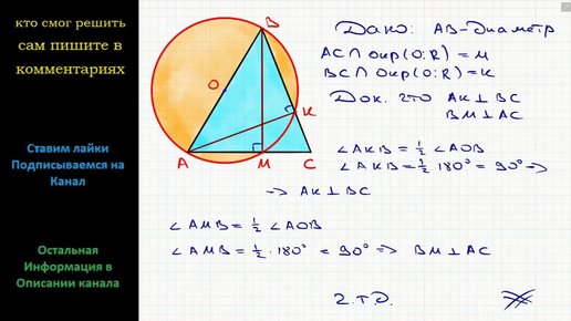 Геометрия Окружность, построена на стороне AB треугольника ABC как на диаметре, пересекает стороны AC и BC в точках M и K соответственно