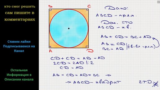 Геометрия Докажите, что если в прямоугольник можно вписать окружность, то этот прямоугольник является квадратом.