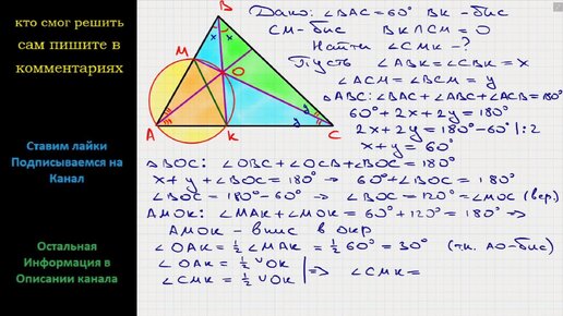 Геометрия Биссектрисы BK и CM треугольника ABC пересекаются в точке O, угол A = 60 Найдите угол CMK