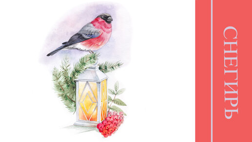 Снегирь на фонаре с веткой ели и рябиной акварелью