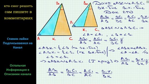 Геометрия Докажите, что в подобных треугольниках биссектрисы, проведенные из вершин соответственных углов, относятся как соответственные