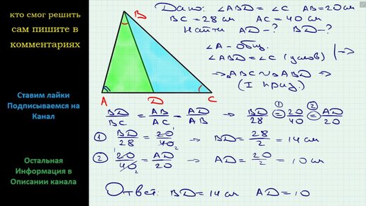Геометрия На стороне AC треугольника ABC отметили точку D такую, что угол ABD = углу C AB = 20 см BC = 28 см AC = 40 см Найдите неизвестные