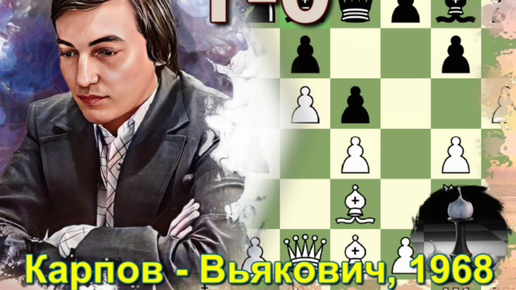 Молодой Анатолий Карпов, белыми, вовсе не комбинируя, идет к цели - громит Вьяковича в Сочи, 1968, играя против современной защиты, 1-0