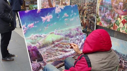 Картинная галерея в парке Музеон в Москве. Художник рисует картину. Обзор картин на продажу