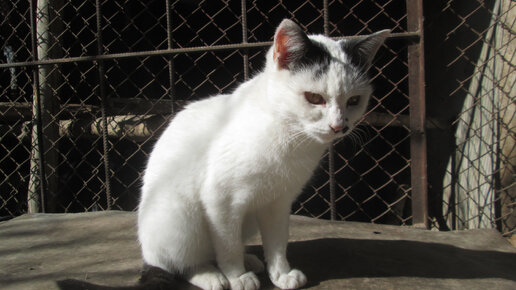Кошка по имени Зая и курёнок пробуют еду друг у друга