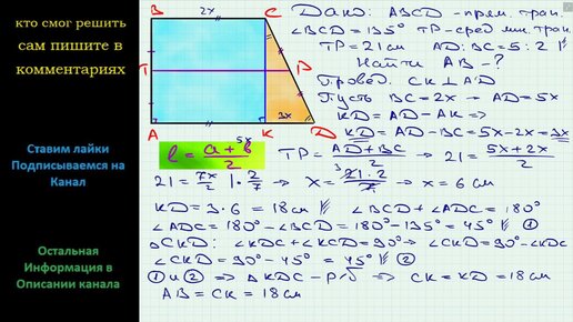 Геометрия Один из углов прямоугольной трапеции равен 135 средняя линия – 21 см а основания относятся как 5:2 Найдите меньшую боковую сторону