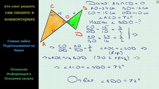 Геометрия Отрезки AB и CD пересекается в точке O (см рис 22 сек) AO = 24 см BO = 16 см CO = 15 см OD = 10 см угол ACO = 72 Найдите угол
