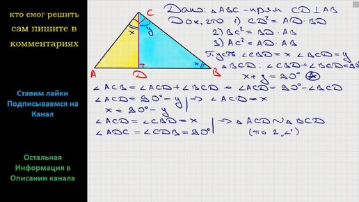 Геометрия Квадрат высоты прямоугольного треугольника, проведенной к гипотенузе, равен произведению проекций катетов на гипотенузу