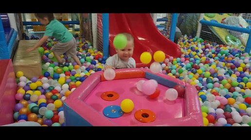 Ребенок играет на детской площадке с мячами и катается на горке