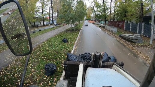 Листва продолжается. Гоняем по городу собираем мешки с листвой.