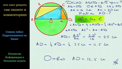 Геометрия Центр окружности, описанной около равнобокой трапеции, принадлежит ее большему основанию. Найдите радиус этой окружности, если