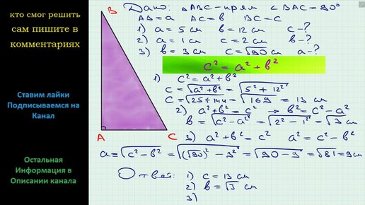 Геометрия Пусть a и b – катеты прямоугольного треугольника, c – его гипотенуза. Найдите неизвестную сторону треугольника, если: 1) a = 5 см