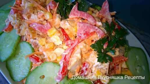 Салат праздничный с курицей, кукурузой и сухариками. Красивое оформление салата на праздничный стол