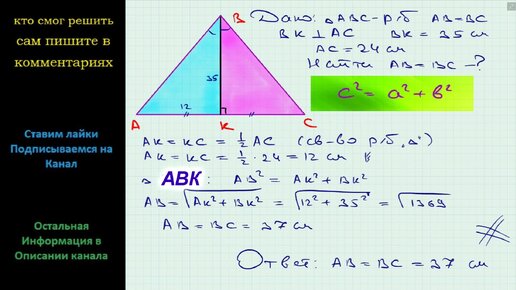 Геометрия Высоте равнобедренного треугольника, проведенная к основанию, равна 35 см, а его основание 24 см. Чему равна боковая сторона