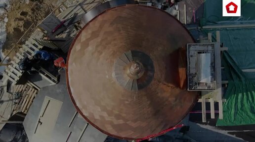 Дом с особенной архитектурой. Монтаж медной кровли в процессе строительства загородной семейной усадьбы.