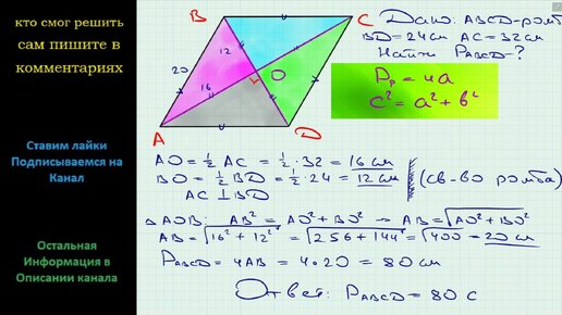 Геометрия Найдите периметр ромба, диагонали которого равны 24 см и 32 см