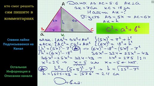 Геометрия Из точки к прямой проведены две наклонные длины которых относятся как 5:6 а проекции этих наклонных на прямую равны 7 см и 18 см