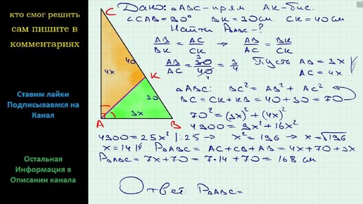 Геометрия Найдите периметр прямоугольного треугольника, если биссектриса прямого угла делит гипотенузу на отрезки длиной 30 см и 40 см