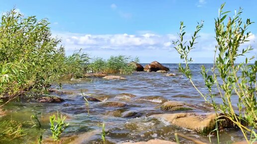 Тёплое, летнее озеро жарким днем Освежающие всплески воды о камни на берегу