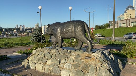 Скульптура тигра у Мариинского театра с видом на Золотой мост. Владивосток