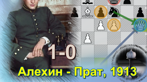 Обожаю эту партию Алехина: выпотрошил Прата, что охотился за белым слоном. Сан Саныч сплел матовую сеть, отдав ферзя в сеансе (Париж, 1913)