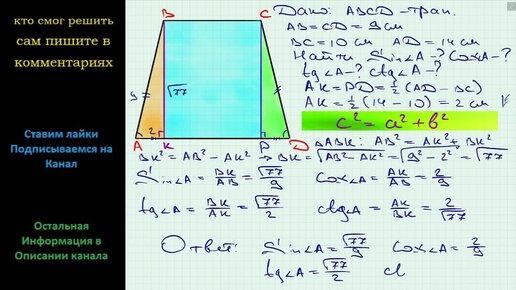 Геометрия В трапеции ABCD известно, что AB = CD = 9 см, BC = 10 см, AD = 14 см. Найдите синус, косинус, тангенс и котангенс угла A трапеции