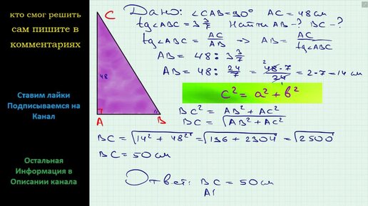 Геометрия Катет прямоугольного треугольника равен 48 см, а тангенс противолежащего угла равен 3 3/7 . Найдите второй катет и гипотенузу